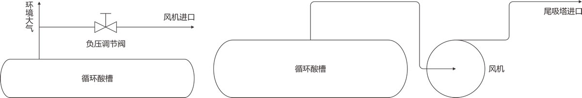 目前,硫酸生產(chǎn)裝置通過(guò)使用碳鋼管道將干燥循環(huán)槽和二吸塔循環(huán)槽與主風(fēng)機(jī)進(jìn)口相連,利用主風(fēng)機(jī)的負(fù)壓效應(yīng)來(lái)回收產(chǎn)生的酸性氣體,并將其重新引入制酸系統(tǒng)以生產(chǎn)硫酸。鑒于干燥塔和二吸塔的循環(huán)酸泵槽內(nèi)襯有耐酸磚,這些磚塊無(wú)法承受振動(dòng)負(fù)荷,因此泵不能直接安裝在泵槽上,而必須設(shè)置獨(dú)立的泵架。由于泵架與泵槽之間存在無(wú)法消除的間隙,使用一段時(shí)間后,我們發(fā)現(xiàn)連接管道無(wú)法實(shí)現(xiàn)與干燥泵座和二吸座的完全密封。結(jié)果,含水空氣通過(guò)這些間隙滲入泵槽內(nèi)部,與酸性物質(zhì)混合形成稀酸。稀酸腐蝕管道后產(chǎn)生的酸泥堵塞了通道,導(dǎo)致酸性氣體無(wú)法被抽送到主風(fēng)機(jī)進(jìn)口。這最終導(dǎo)致酸性氣體直接排放到大氣中,對(duì)環(huán)境造成了嚴(yán)重污染。為了解決這一問(wèn)題,一些硫酸裝置已經(jīng)對(duì)原有的廢氣回收工藝進(jìn)行了改進(jìn),采用了風(fēng)機(jī)抽吸的方法。