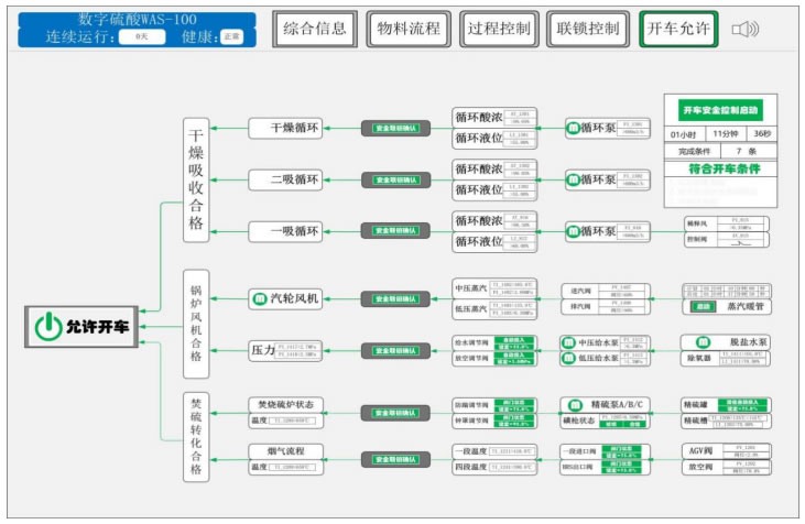 硫酸裝置的開車過程復雜且漫長,伴隨諸多安全風險,涉及多個工藝段的相互耦合和化學反應。傳統(tǒng)硫酸裝置的開車依賴于多工段人員的協(xié)作,但因協(xié)調不暢,常導致安全事故。為降低硫酸行業(yè)在開車過程中的安全風險,并實現(xiàn)裝置的自動化運行,禮正來科技根據(jù)不同硫酸工藝,自主研發(fā)了“一鍵開車”功能。該功能涵蓋以下關鍵環(huán)節(jié):開車前的安全檢查、工藝參數(shù)的自動調整與確認、開車過程中工藝參數(shù)的自動調節(jié)、安全控制措施的實施,以及通過物料平衡的自動比對完成整個開車過程。