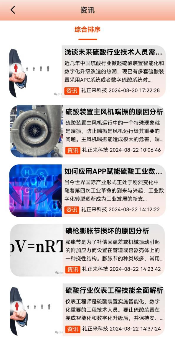 功能一——新聞資訊:APP首頁設(shè)有新聞和資訊專區(qū),內(nèi)容豐富,不僅包括硫酸生產(chǎn)過程中遇到的問題及其原因分析與解決方案,還提供了各種設(shè)備和儀器的使用指南。專區(qū)還匯聚了硫酸行業(yè)的最新動態(tài),無論是重大新聞還是行業(yè)小報(bào),都能讓使用者在瀏覽APP的同時(shí),迅速掌握行業(yè)內(nèi)的實(shí)用信息,從而在專業(yè)領(lǐng)域中提升自己的知識水平。