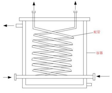 蛇管多以金屬管彎繞而成,沉浸在容器中兩種流體分別在管內(nèi)外流動(dòng)。