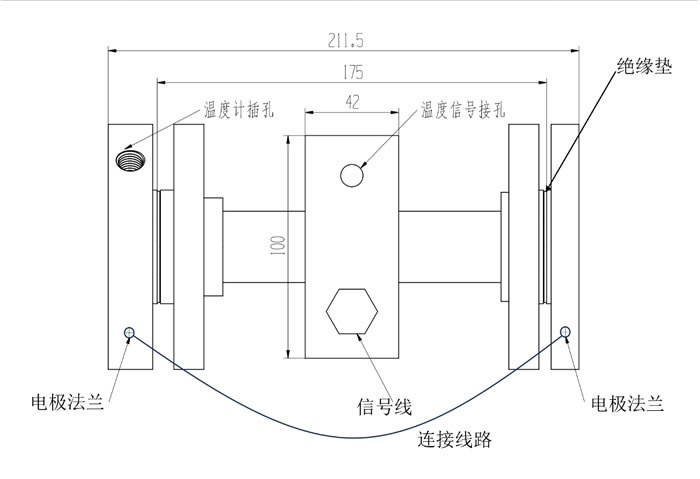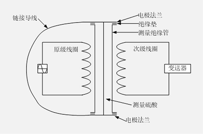 電導率傳感器由探測頭、信號電纜、溫度補償熱電偶、測量管及其連接法蘭組成;探測頭采用兩個線圈,一個作為發(fā)送器,另一個作為接收器,利用保護盒將環(huán)境和過程液體完全隔離。當發(fā)送器線圈通電,硫酸導電產生感應電流,感應電流與硫酸的電導率成正比,接收器線圈檢測電流的大小由信號電纜輸出到變送器,從而計算出硫酸的濃度;由于高溫硫酸具有強腐蝕性,加上絕緣材料無法承受高溫,兩個線圈不能直接浸入接觸硫酸,所以測量探頭安裝在襯有聚四氟乙烯的測量管上;為了能正常運行使用,需要把傳感器兩端的電極法蘭用導線接通,當硫酸流過測量管時,形成一個導電回路,如圖1所示。